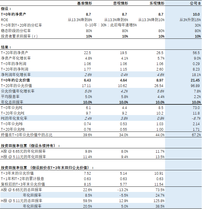 表一:对建行投资价值的情景分析以及和公司B的对比